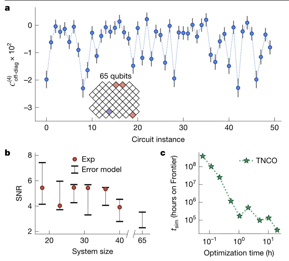 這種“大循環干涉”讓經典計算機很難模擬。他們用最強超級計算機Frontier嘗試模擬 65 個量子比特的 OTOC?²?信號,需要約 3.2 年;而量子處理器測一次只需要 2.1 小時,速度差了1.3萬倍。